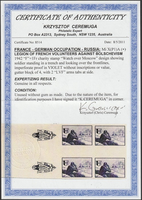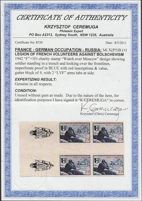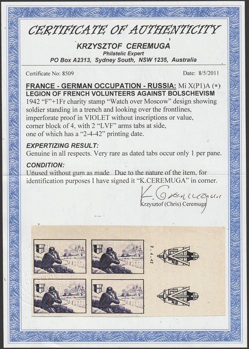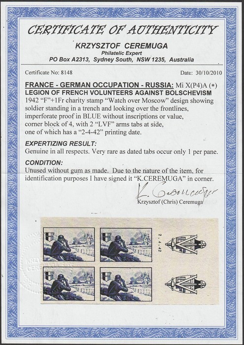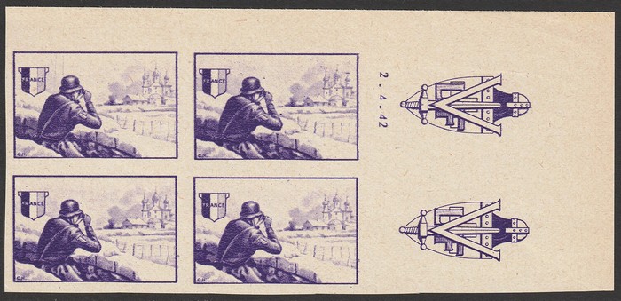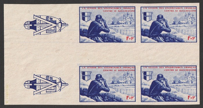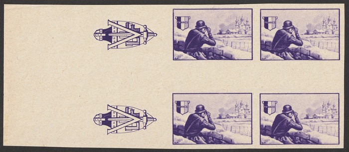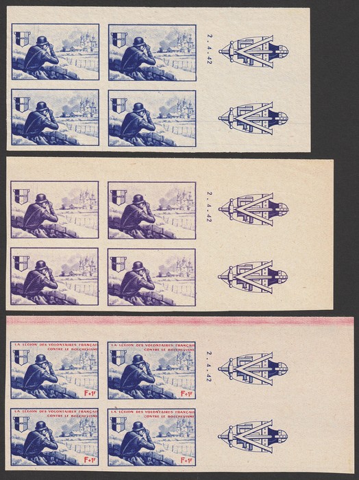 1942 French Legion on the Eastern Front battle scenes F+1F charity stamps with Watch over Moscow design of soldier looking over the front lines imperf proofs in blue with & w/o red text & in violet w/o text, all UR imperf blks of 4 with pictorial