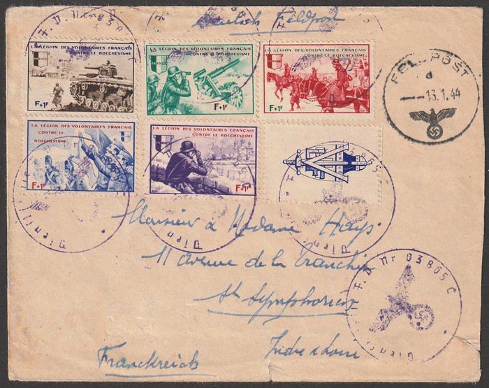 French Legion on the Eastern Front battle scenes F+1F charity stamps with 'Watch over Moscow design of soldier looking over the front lines set of 5 tied to Fieldpost cover by 'Dienstelle F.P. Nr03865' censor cachet, with 'Feldpost 13 1 44' cds. To