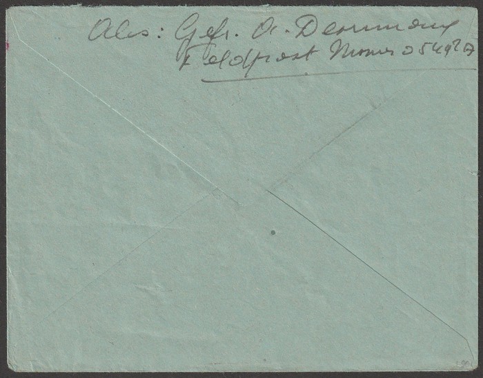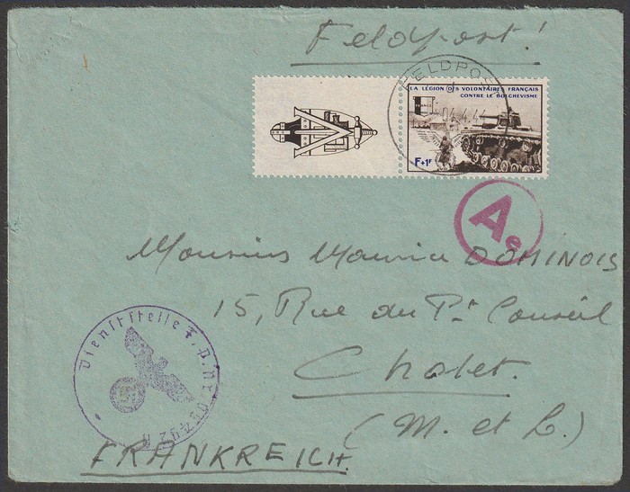 French Legion on the Eastern Front battle scene F+1F violet & red charity stamp with pictorial tab & with 'Watch over Moscow' design of soldier looking over the front lines, tied to Fieldpost cover by 'Feldpost 19 2 44' cds, & 'Dienstelle F.P. Nr