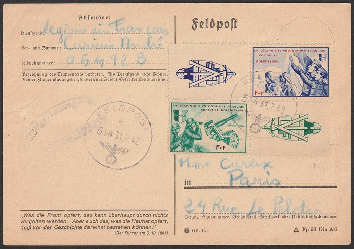 1942 French Legion on the Eastern Front battle scenes F+1F blue & F+1F green with pictorial tabs, 'Infantry' & 'Artillery' designs tied to Fieldpost card by 'Feldpost 514 31 7 42' cds to Paris. Mi VII & IX, Maury 7&8 cat €350+ (P) (Image1) (Image2)