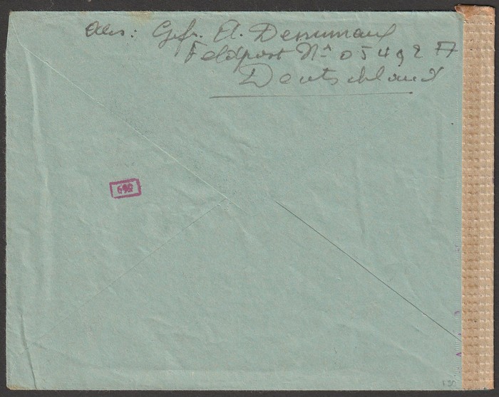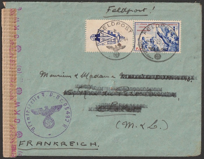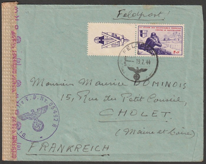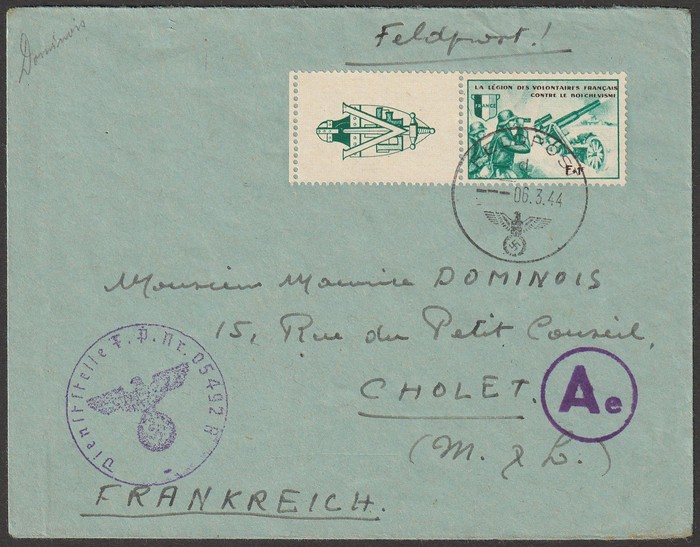 French Legion on the Eastern Front battle scene F-1F green & purple charity stamp with pictorial tab with 'Artillery' design of soldiers firing, tied to Fieldpost cover by 'Feldpost d 06 3 44' cds, Dienstelle F.P. Nr 05492B' cachet & censor h/s at