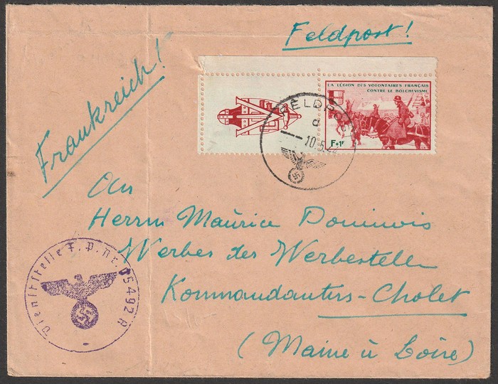 French Legion on the Eastern Front battle scene F+1F red & blue charity stamp with pictorial tab & with 'Cavalry' design of mounted soldiers advancing, tied to Fieldpost cover by 'Feldpost d 10 5 44' cds with censor tape & h/s on reverse, to France.