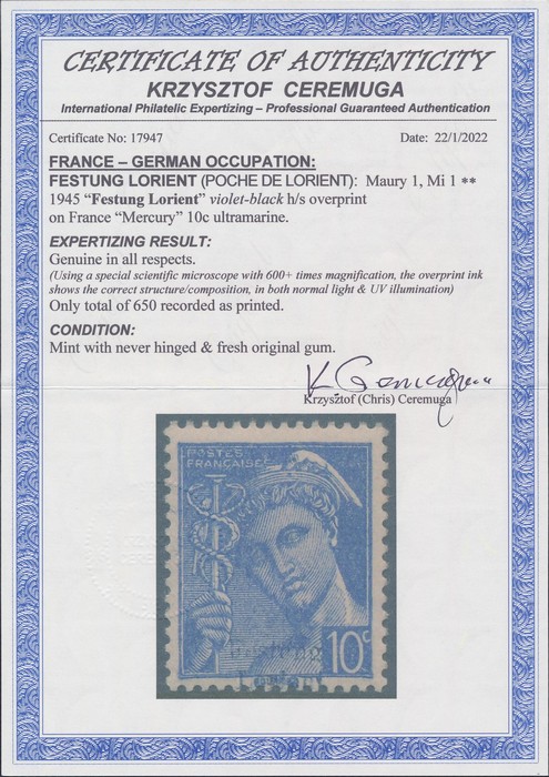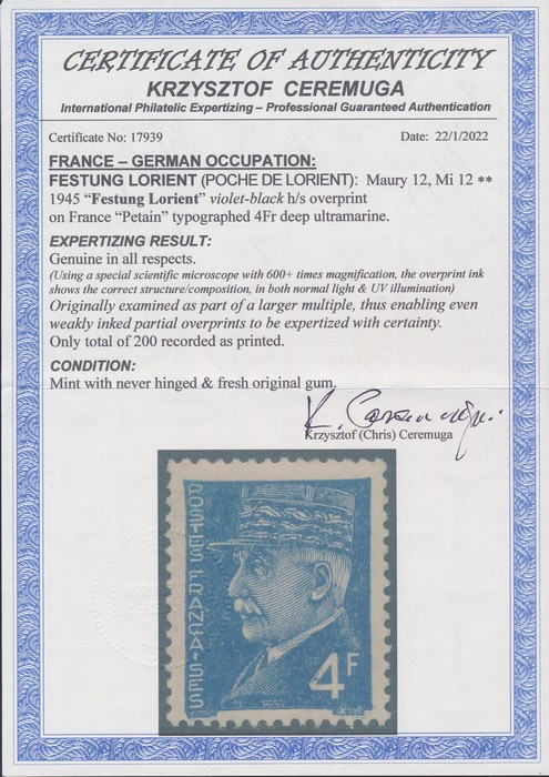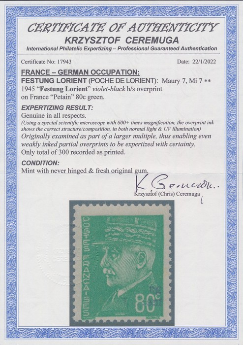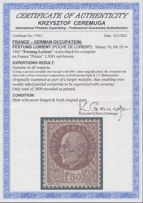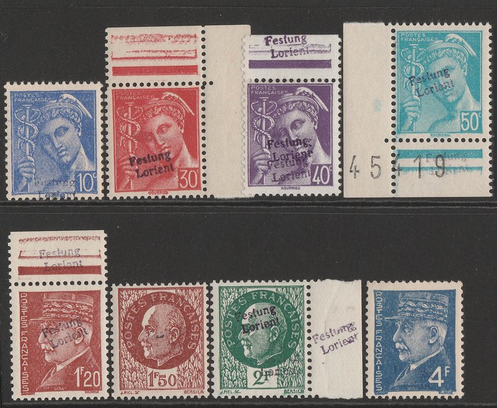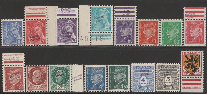 Atlantic Pocket 'Festung Lorient' h/s opts on Mercury 10c-50c, Petain 60c-4.50Fr, Arc de Triumph 4Fr & 5Fr, plus Arms 5Fr, with 5 stamps genuine opts (with certificates), & 11 stamps forged opts (expertised as such). VF fresh MNH. Mi 1-15 would cat