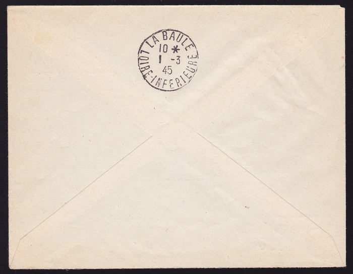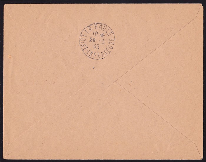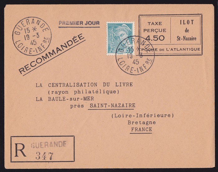 Nazaire Atlantic Pocket 'Poche de Altlantique' Taxe Percu 4.50Fr black on buff reg envelope, 'Guerande 19.3.45' cds & 'La Baule 20.3.45' arrival b/s. Superb fresh. Mi U2, Mayer 7 cat €500+. Rare. (P) (Image1) (Image2)