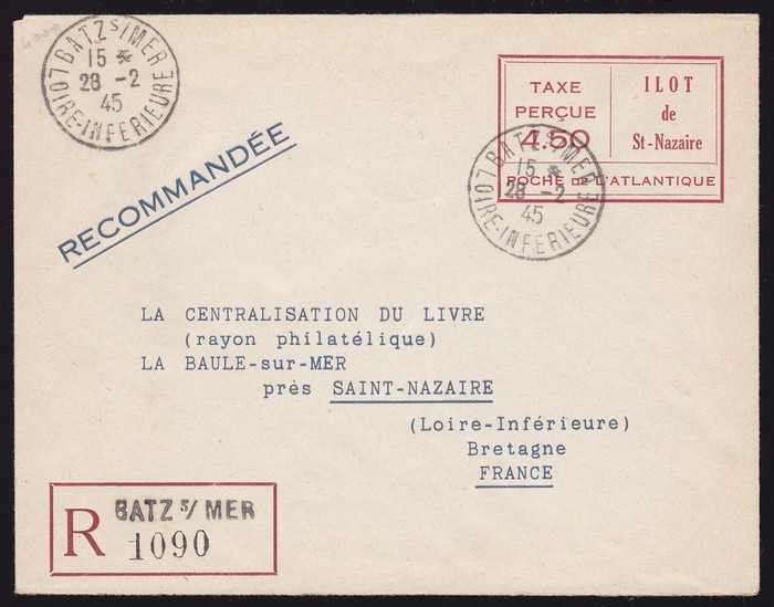Nazaire Atlantic Pocket 'Poche de Altlantique' Taxe Percu 4.50Fr red on white reg envelope, with 'Batz s/Mer 28.2.45' cds & 'La Baule 1.3.45' arrival b/s. Superb fresh. Mi U1, Mayer 6 cat €450+. Rare. (P) (Image1) (Image2)
