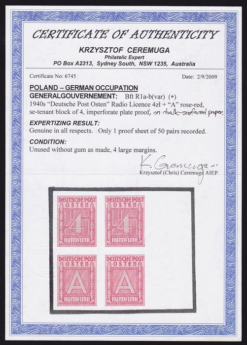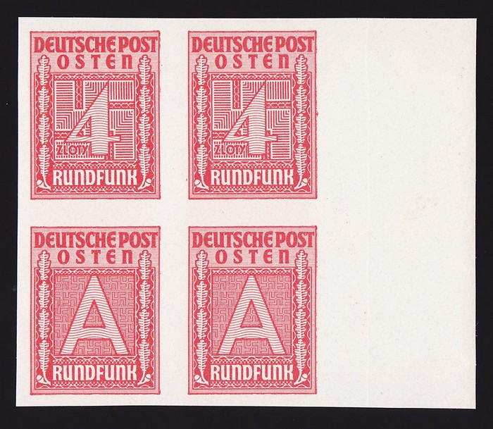 Govt: 1940 Radio Licence Fee 4Zl + 'A' rose-red, IMPERF PLATE PROOF setenant blk of 4 (one for the PO & one for your licence book), thicker chalk-surfaced paper. Superb UN as made, right marginal with all 4 margins. Bft R1a-b(p), Mi 1-2Pl. Only 1