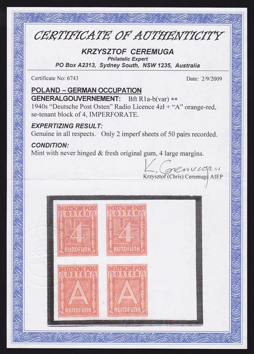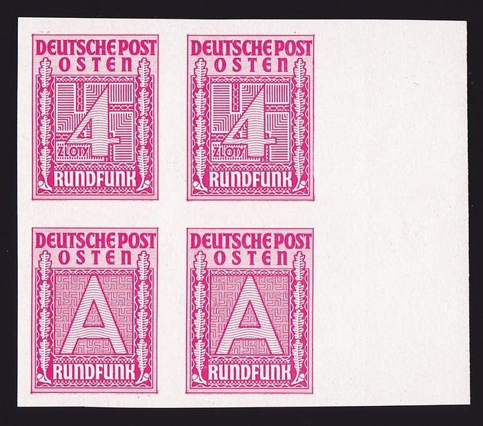 Govt: 1940 Radio Licence Fee 4Zl + 'A' orange-red issued colour, IMPERF setenant blk of 4 (one for the PO & one for your licence book). Superb fresh MNH, right marginal with all 4 margins. Bft R1a-b(var), Mi R1-2u. Very Rare, only 2 imperf sheets of