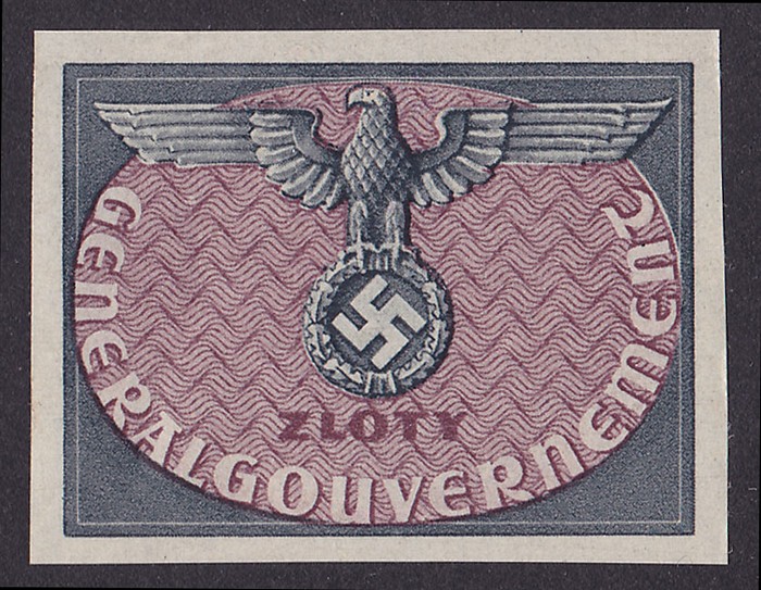 Govt: 1940 Official Eagle & Swastika (5)zl large size imperf PROOF, w/o values. VF fresh MNH, 4 margins. Mi D13PS cat €380. Only 1 sheet of 50 recorded. (P)