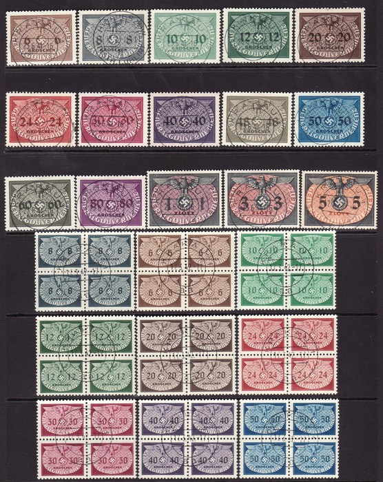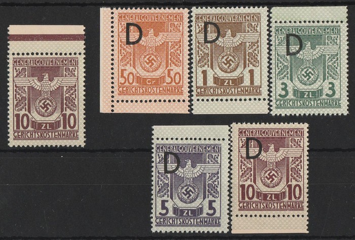 Govt: 1942 Court Fee revenue 10zl,, plus 1943 'D' opt Court Fee set 50gr-10zl. VF fresh MNH. Bft 13 & 14-18 cat £150+ as M or U, plus premium MNH. (6) (Image1)