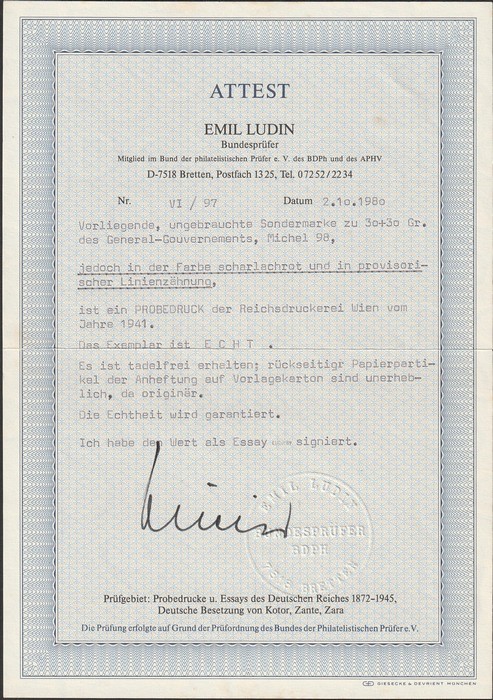 Govt: 1942 Occupation 3rd Anniv 30+30gr Surch in red (instead of purple issued colour) die PROOF colour trial line perf 15. Superb fresh UN. SG 453(var). Mi 98P cat €1200+. Extremely rare with only several recorded. 2025 Ceremuga AIEP photo