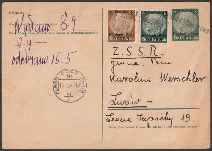 Govt: 1940 use of Hindenburg opt Deutsche Post Osten 12pf/6pf postcard, uprated same opt 6pf/3pf & 12pf/6pf tied by s/l 'Susiec Toma Szewsk' provisional cancels, plus Russian 'Lwow 16 5 40' cds original cds. Mi P1II cat €70, plus the 2 stamps.