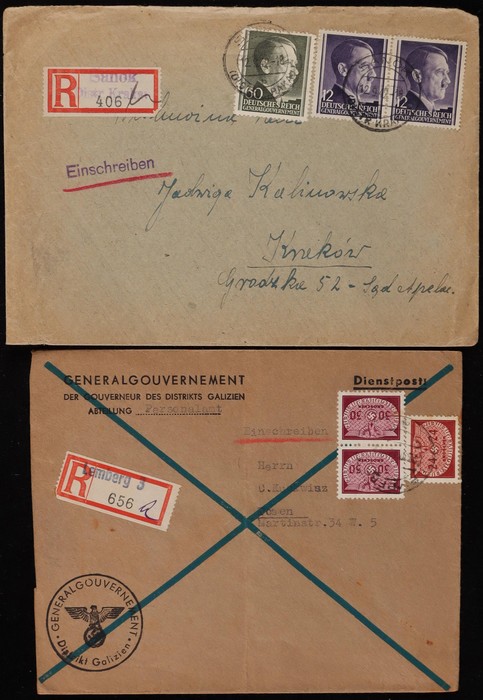 Govt: 1940-43 covers & cards inc Registered, Official & Express. All from towns in eastern Poland now in Ukraine with pmks of Lemberg (9) inc 12gr green or violet postcards, pmks of Drohobycz, Nadworns, Przeworsk, Rawa Ruska, Sanok, Stryu & Tarnopol,