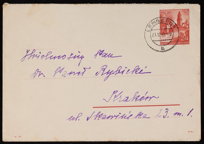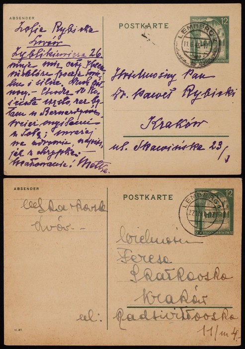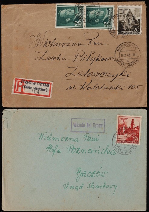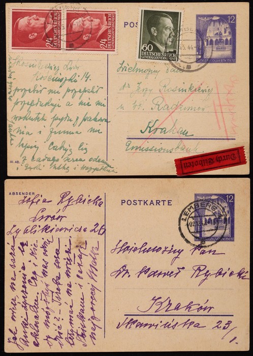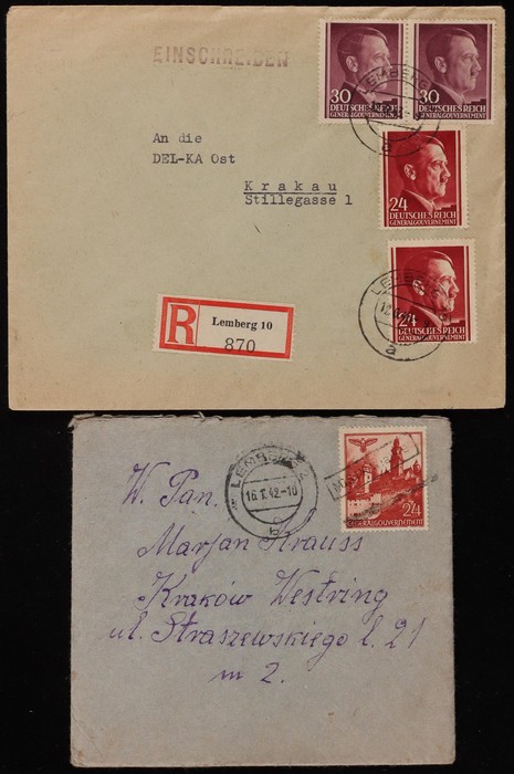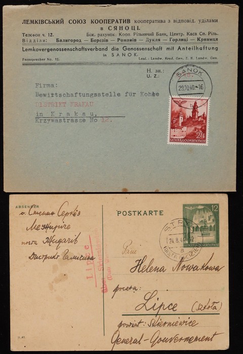 1942-44 covers & cards inc Gen Govt 12gr lilac Postcards (3), 1 with uprating for Express Lemberg-Krakow, 12gr green Postcard Lemberg-Krakow & 24gr red Envelope with Lemberg cds. Mi U2(01), P10 & 12 (01/02) cat €54+++. All from towns in eastern