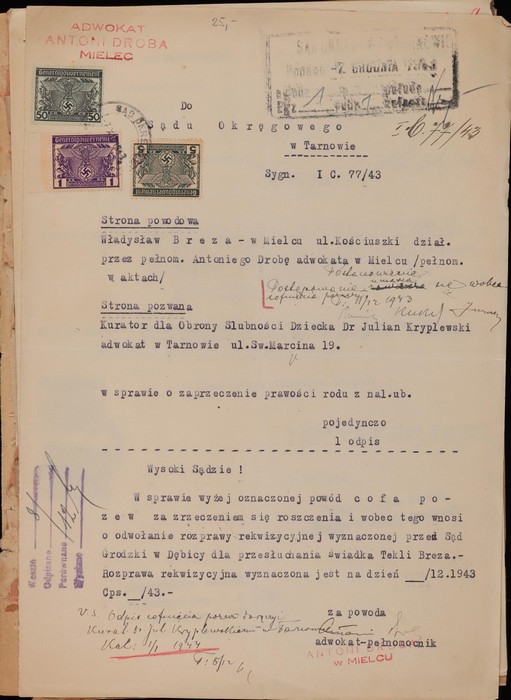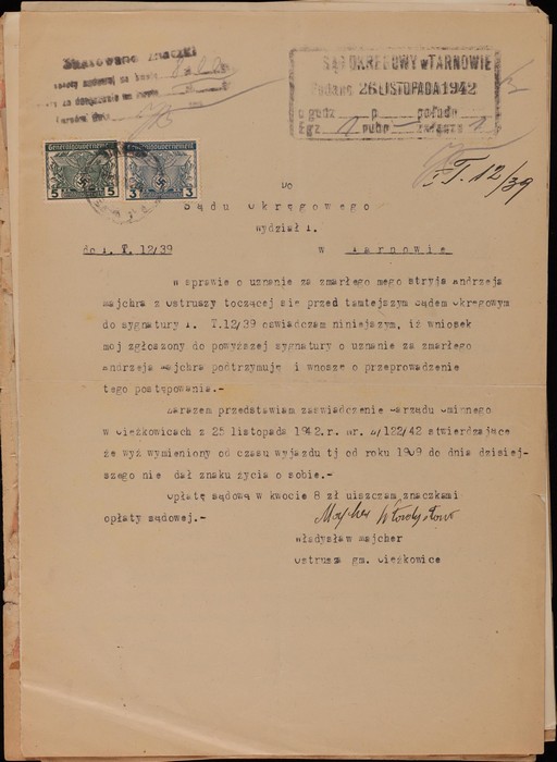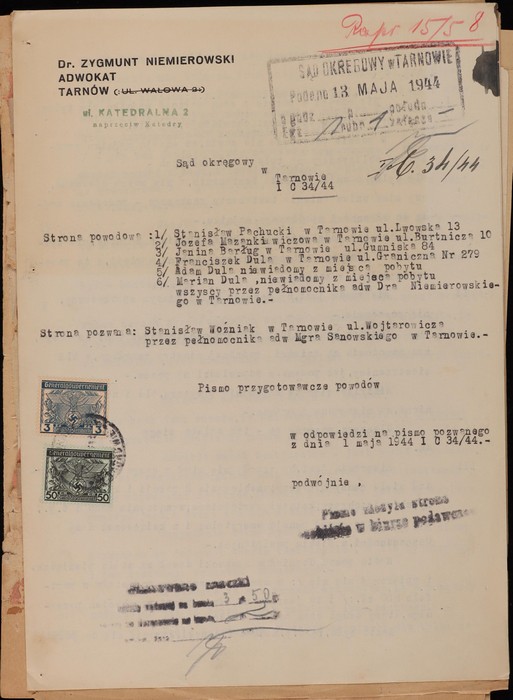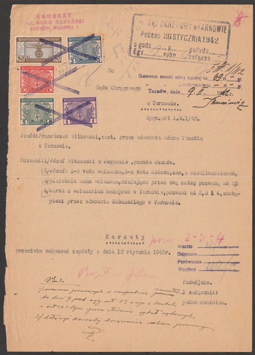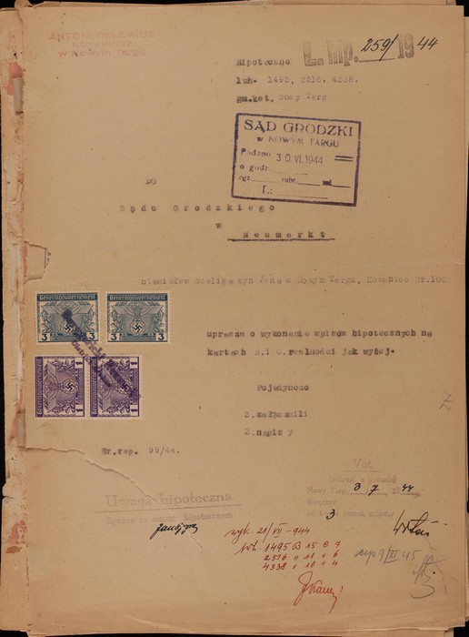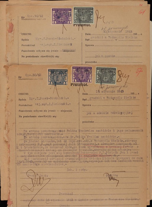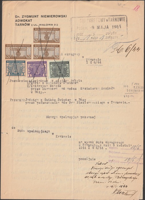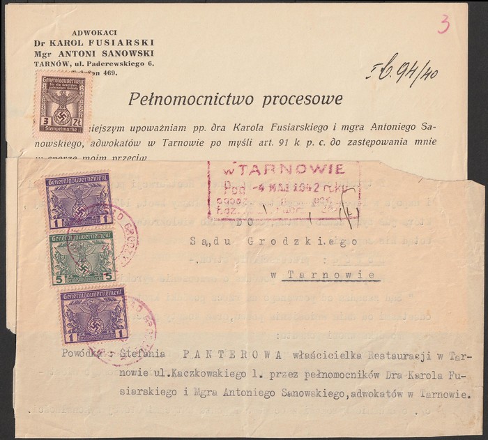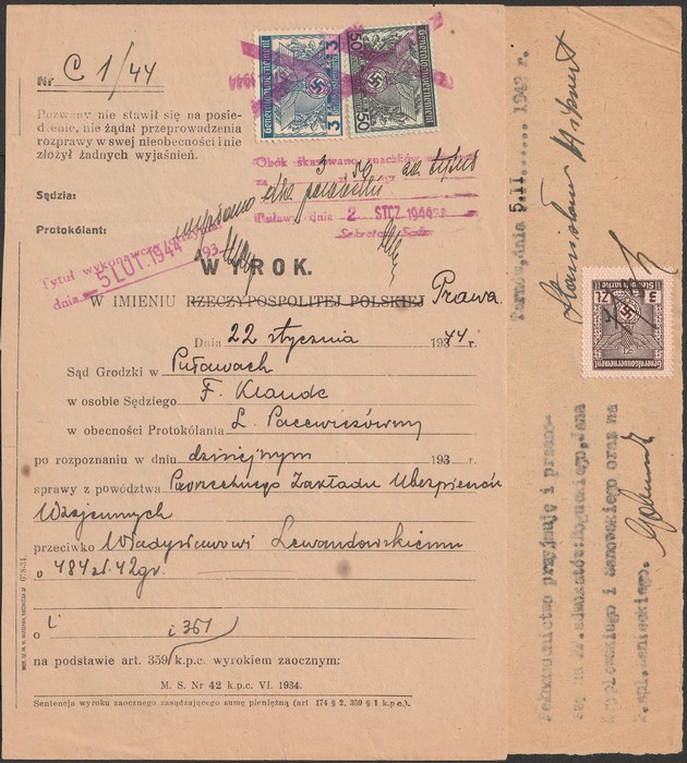Govt: 1940-44 legal documents with various Stamp Duty & Court Fee revenues to 5zl, inc mixed frankings. Mostly F-VF. Interesting lot. (11 docs) (Image1) (Image2)
