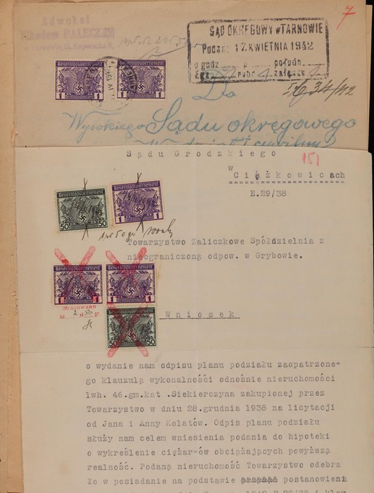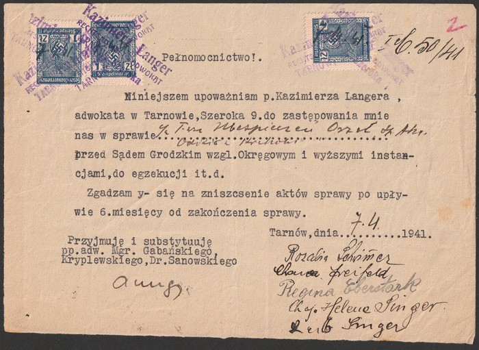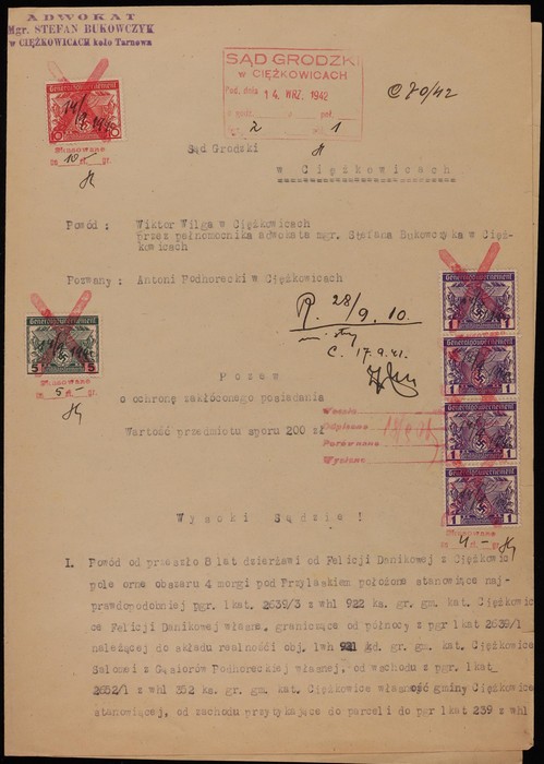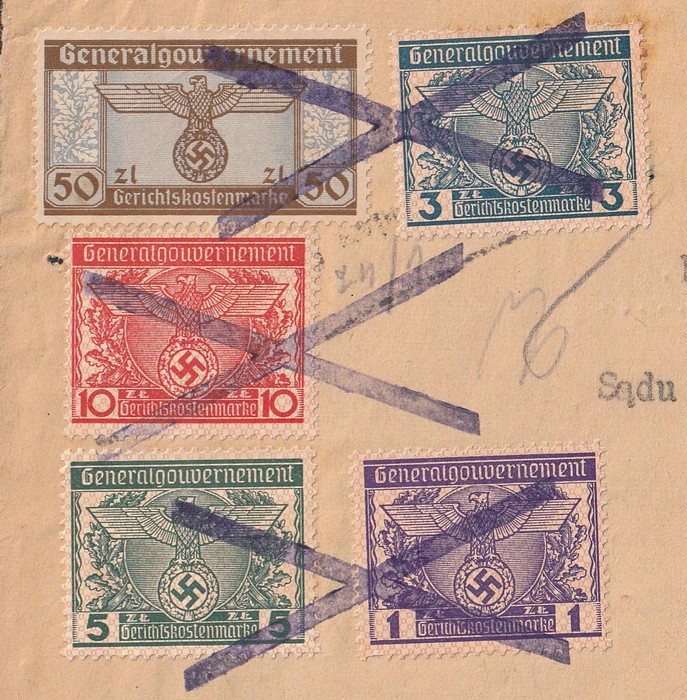 Govt: 1941 legal document franked 1939 Court Fee revenues 1zl (4), 5zl & 10zl, with red h/s. Bft 3, 5 & 6 cat £33+ as loose stamps alone. Attractive. (Image1)