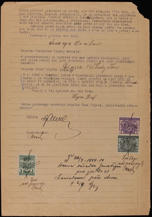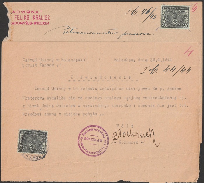 Govt: 1944 legal document franked 1939-43 Court Fee Revenues 50gr, 1zl, 3zl, 5zl & 50zl (3) m/s cancelled. Bft 2-4 & 19 cat £166 as loose stamps alone, plus premium on document. Attractive & rare to value usage. (P) (Image1) (Image2)
