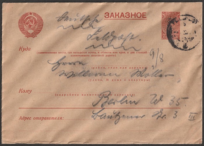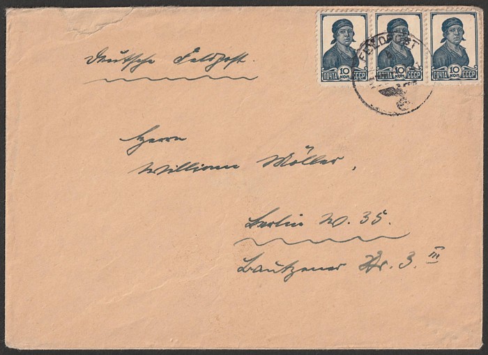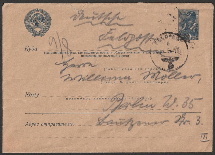 Union: 1941 cover franked Worker 10k (3) with Feldpost cds dated 1941. Similar period uses of Pilot 30k blue, & Arms 60k red Postal Stationery Envelopes, all sent by German soldier. (3). (Image1) (Image2)