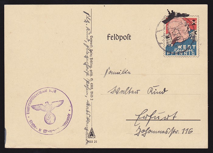 'F.M' violet h/s opt Hitler 12pf red, error h/s SIDEWAYS!, plus Numeral Provisionals, 14 x 9½mm double-lined blue frame 5pf & 8pf violet numeral & 6pf & XII Pfr blue-black numerals, all large numeral with red signature, all tied by