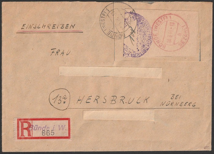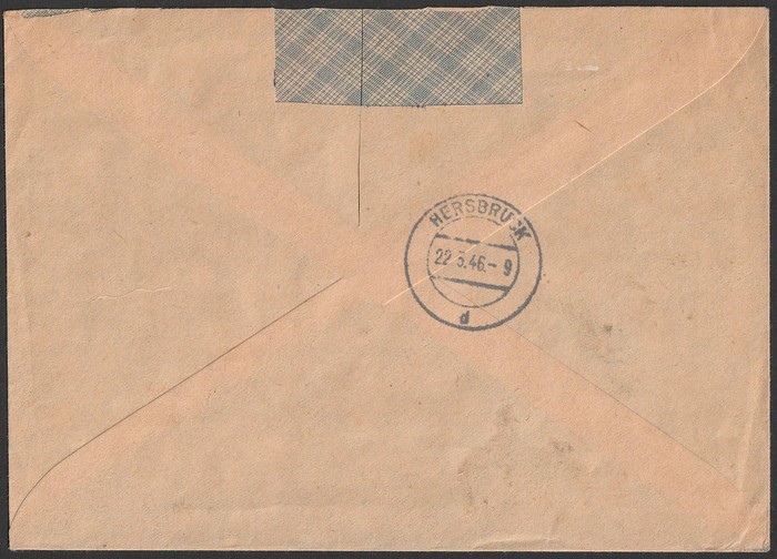 Provisional 1.08 in semi-circular violet h/s with red cds, & tied by black cds on reg cover (names excised) with 'Hersbruck 22.3.46 arrival b/s. Mi 3 cat €800 as loose stamp & €1000 on cover). Sturm BPP photo cert. (P) (Image1) (Image2)