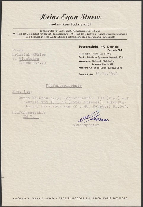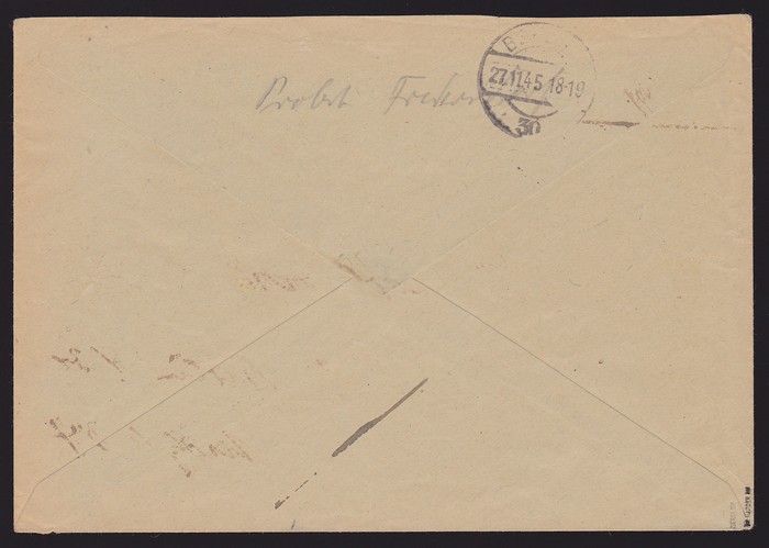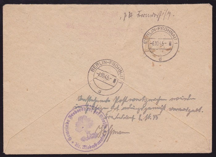 Numeral Provisionals, format 43x31½mm, double lined blue frame 8pf, large numerals, plus 'F.M' h/s in red with 'Fredersdorf 23 OKT 1945 Berlin' violet oval pmk on cover, with boxed rectangular 'Gebuhr bezahlt' h/s. Mi Sp172 cat €110 as