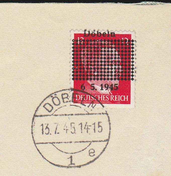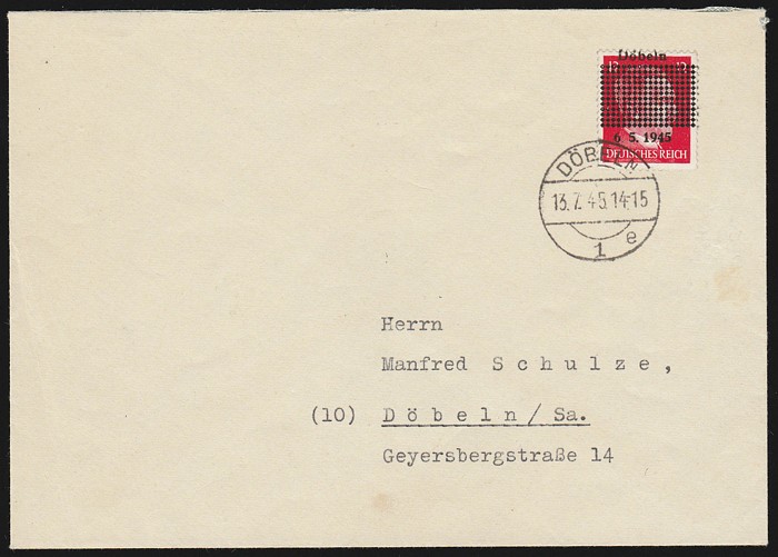 'Dobeln 6.5.1945' & dotted pattern trial opt Hitler 12pf red on cover with 'Dobeln 13.7.45' cds. Superb fresh. Mi PII cat €1700 as loose stamp & €2400 on cover. Very rare genuine trial opt as only 100 printed & fantastic cover for
