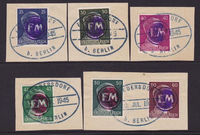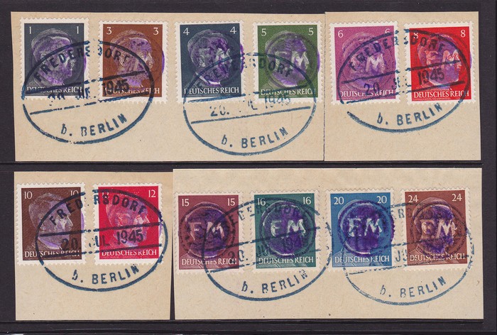 'F.M' violet h/s opts Hitler set 1pf-5Mk, 1Mk & 2Mk perf 14 & 3Mk & 5Mk perf 12½. VFU, all on piece with 'Fredersdorf 20 JUL 1945 Berlin' cds in blue Mi 1-19, 20B, 21B, 22A, 23A cat €530+. Rare genuine set. (23). (P) (Image1) (Image2)