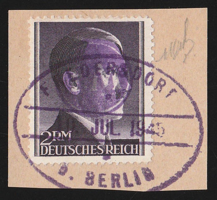 'F.M' violet h/s opt Hitler 2Mk violet, perf 12½. VFU, on piece with 'Fredersdorf 10 JUL 1945 Berlin' violet oval pmk. Mi 21A cat €90+. Exp Bloch AIEP.