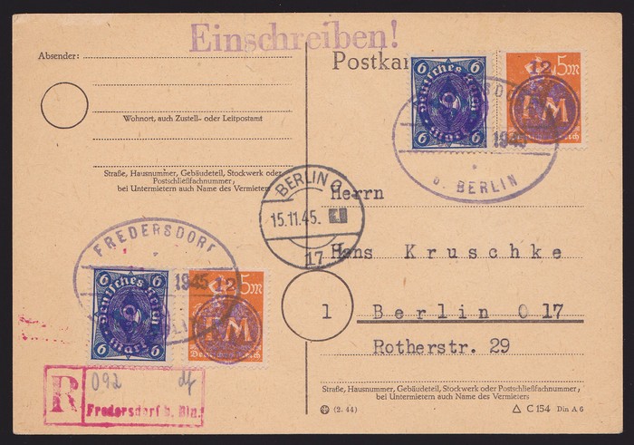 'F.M' violet h/s opts on Inflation 6Mk dark blue & 12/5Mk orange, 2 sets tied by 'Fredersdorf 15.11.1945 Berlin' oval pmk to registered Postcard, addressed to Berlin. Mi 67-68 cat €400 as loose stamps & €600 for on cover. Very rare. Exp Dr