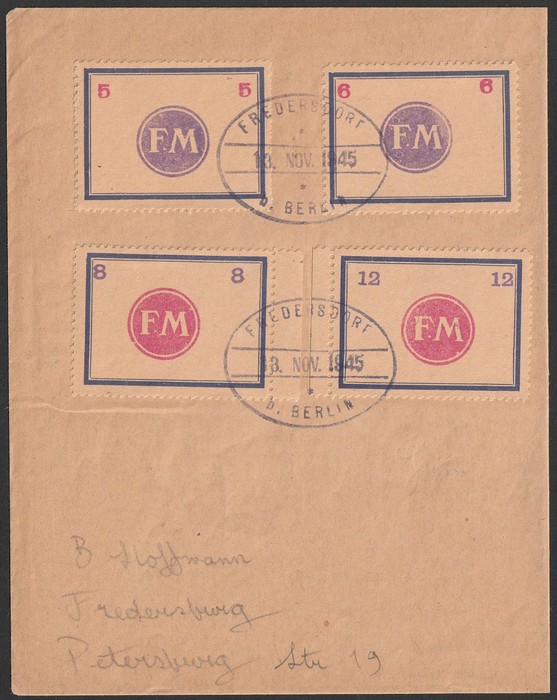 Numeral Provisionals set large format blue frame 43x30mm, with 'FM' h/s in violet (5pf & 6pf) or in red on 8pf or 12pf, tied on cover by 'Frederdorf 13 NOV 1945' oval pmks. VFU. Mi Sp174-Sp177 cat €440+ as loose stamps. Rare as only 150 of ea