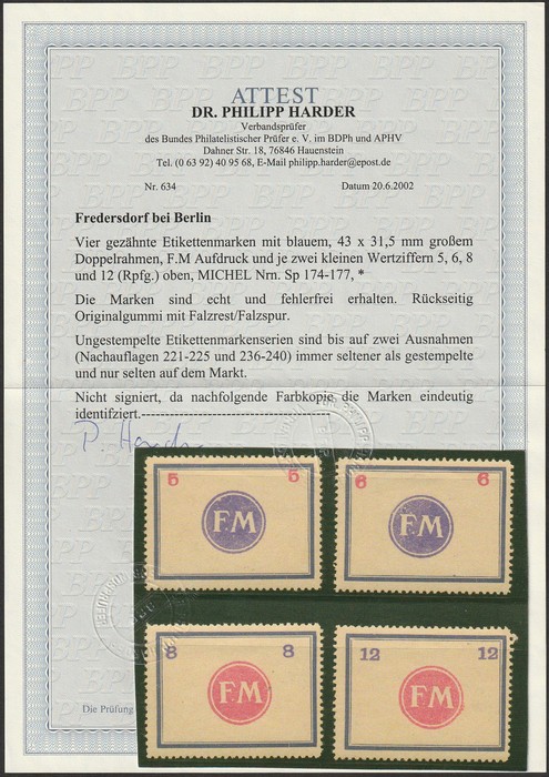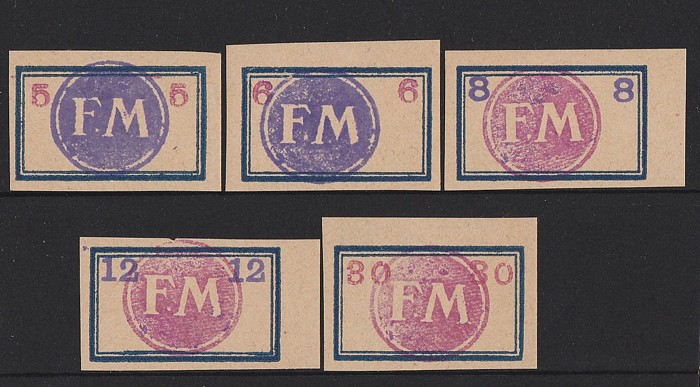 Numeral Provisionals set large format blue frame 43x30mm with 'FM' h/s in violet (5pf & 6pf) or red 8pf & 12pf. VF fresh MLH. Mi Sp174-Sp177 cat €2400. Extremely rare in mint condition as only 50 of ea printed & vast majority used. 2002 Dr