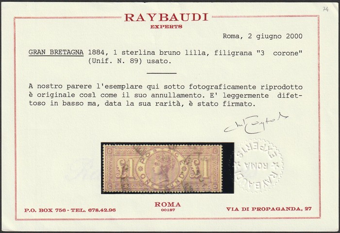 brown-lilac, wmk 3 Crowns, letters DC-CD. Superb U, light cancel, nice colour & excellent centring. Scott 110 cat US$3500+. SG 185 cat £2750+. Rare so lightly used. 2000 Raybaudi photo-cert. (P) (Image1) (Image2)