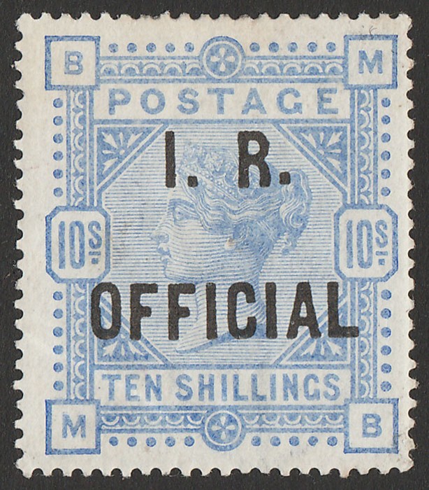 OFFICIAL' opt QV 10/- ultramarine. VF fresh M. Scott O9 cat US$11,500, SG Spec L8(4). SG O10 cat £11,500 but opt is forged (genuine basic stamp alone cat £2200). Attractive. (P) (Image1)