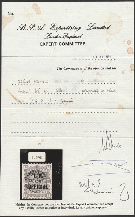 OFFICIAL opt QV 10/- ultramarine on white paper. Superb U with Manchester cds. Scott O9 cat US$3600, SG O10 cat £3750+. Beautiful stamp & extremely rare as such a nice genuine example. 1984 BPA & 2012 RPSL photo certs. (P) (Image1) (Image2)
