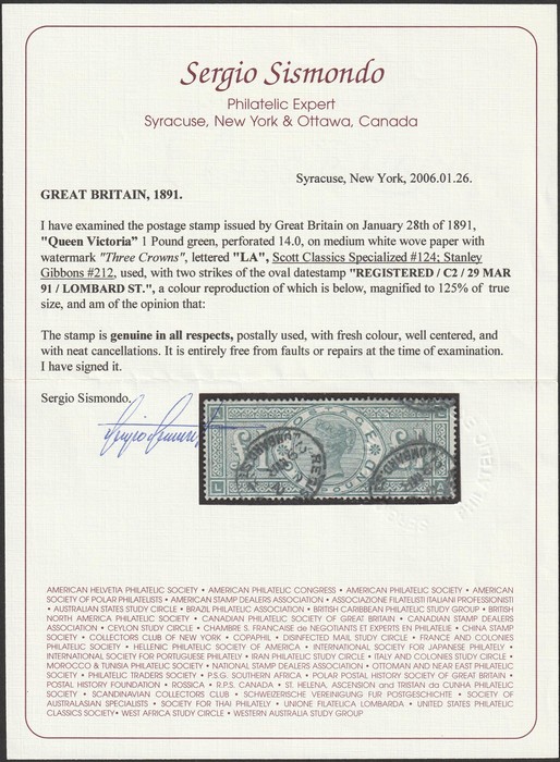green, letters AL-LA. VFU, 2 oval registered pmks, nice perfs & deep colour. Scott 124 cat US$925. SG 212 cat £675. 2006 Sismondo photo-cert. (P) (Image1) (Image2)