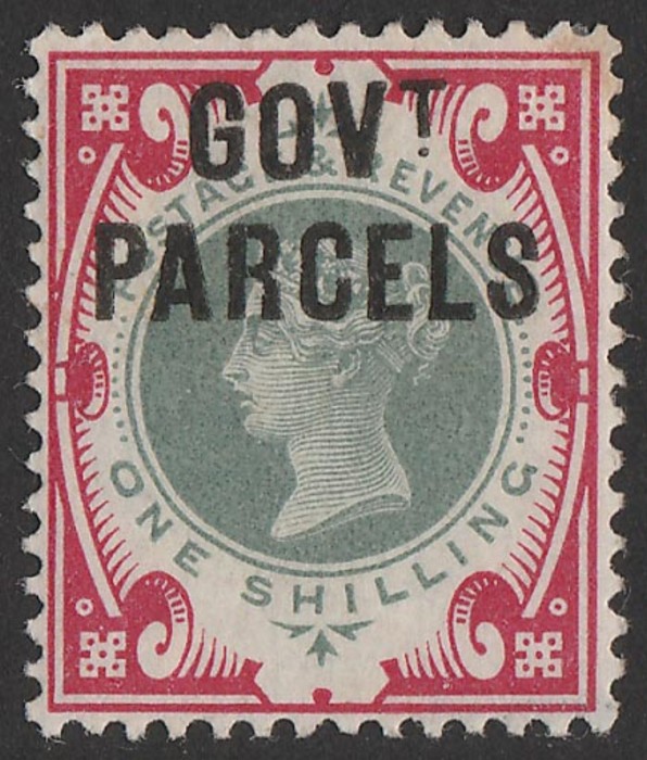 PARCELS' opt QV 1/- green & carmine. Superb fresh MLH, beautiful deep colours. Scott O38 cat US$725, SG Spec L30. SG O72 cat £650. Scarce genuine. (P) (Image1)