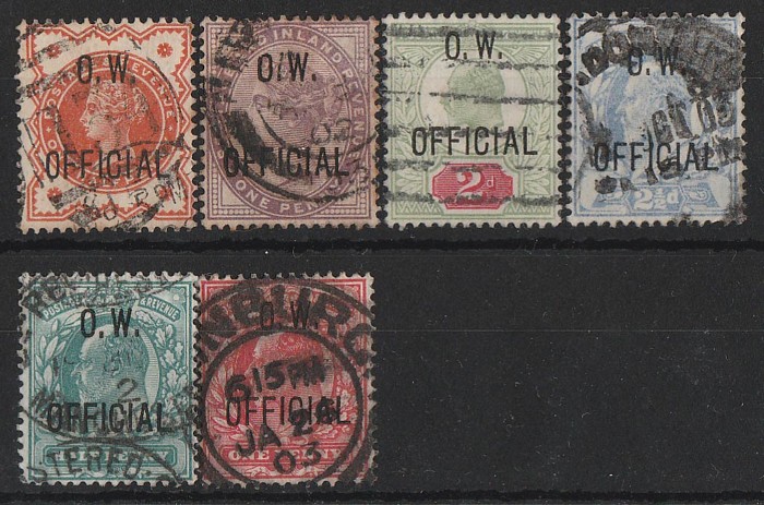OFFICIAL' opts QV ½d vermilion & 1d lilac, plus 1902-03 KEVII ½d, 1d, 2d & 2½d. G-VFU. SG O31, 36-39 cat £1785. Rare genuine. (6). (P)