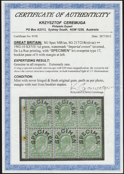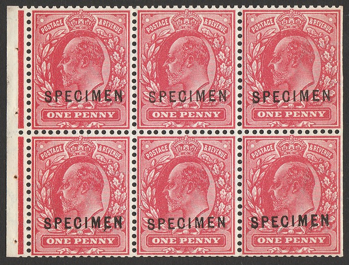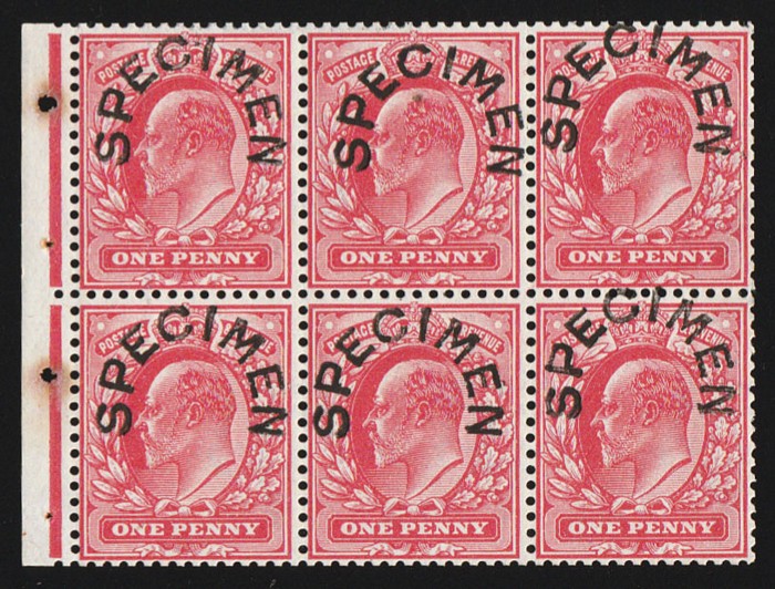 red, DLR printing, left marginal bklt pane of 6, opt SPECIMEN (SG type 22), wmk Imperial Crown INVERTED. VF fresh MNH. SG 219wis, SG Spec MB5at cat £1800, plus 40% SG Specified premium MNH, £2520. Extremely rare. 2021 Ceremuga photo cert.