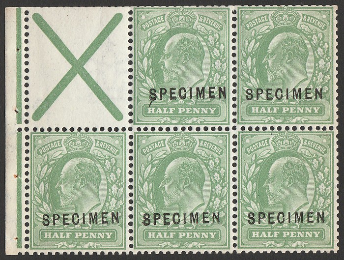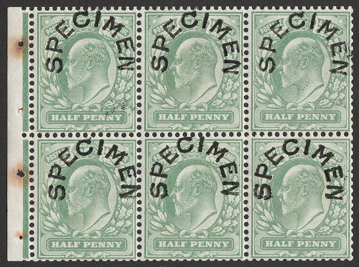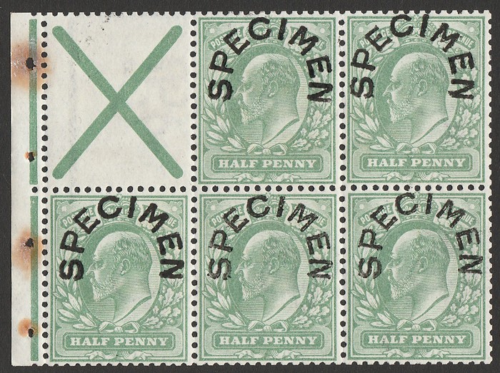 ½d green, DLR printing, left marginal bklt pane of 6, opt SPECIMEN (SG type 22), wmk Imperial Crown INVERTED. VF fresh MNH. SG 27s(var), SG Spec MB1at cat £2000, plus +40% SG specified premium MNH £2800. Extremely rare. 2021