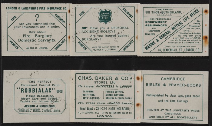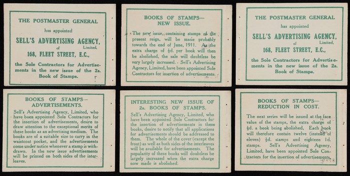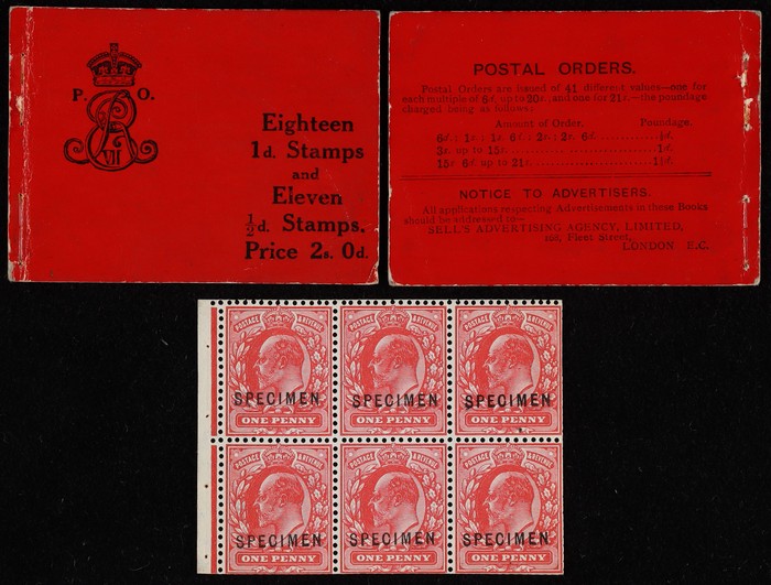 red DLR printing, left marginal bklt pane of 6, opt SPECIMEN (SG type 17), wmk Imperial Crown inverted, plus front & back bklt covers & advert inserts (6 diff). Stamp superb fresh MNH, plus also the booklet covers & all advert pages from the original