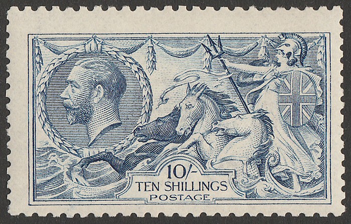 10/- blue, DLR printing. VF MNH, with never hinged original gum. Scott 175b cat US$4600. SG 412 cat £3250 & under-catalogued MNH (as M cat £2500). Rare genuine MNH. 2024 Ceremuga AIEP photo cert. (P) (Image1)