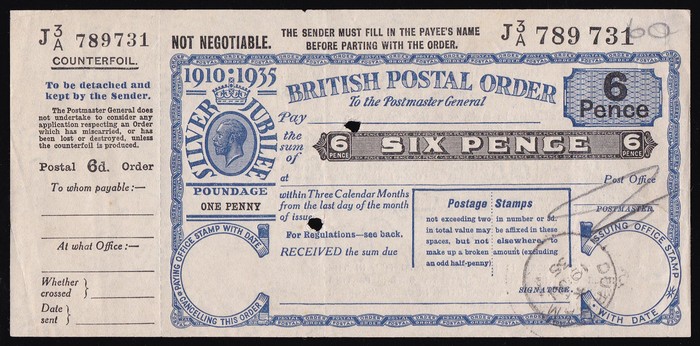 Jubilee 6d blue Postal Order wmk GvR, with 'Durham 19 JU 35' issue cds, but not cashed, with counterfoil & 2 security punches. EF. (Image1)