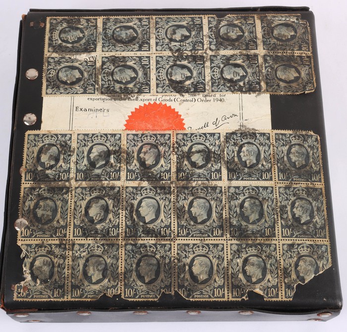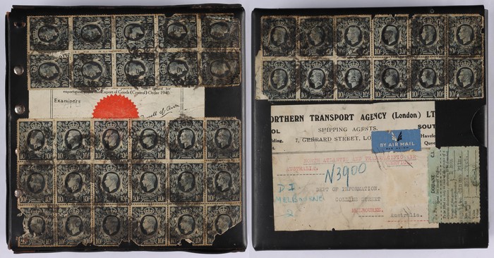 parcel (plastic with leather hinges, 190x190x50mm) sent via 'North Atlantic & Trans-Pacific Air Service' to Department of Information, Melbourne, (22 Oct). Extraordinary franking of KGVI 10/- dark blue (40) & missing a single 5/-, that paid 90 x 4/6