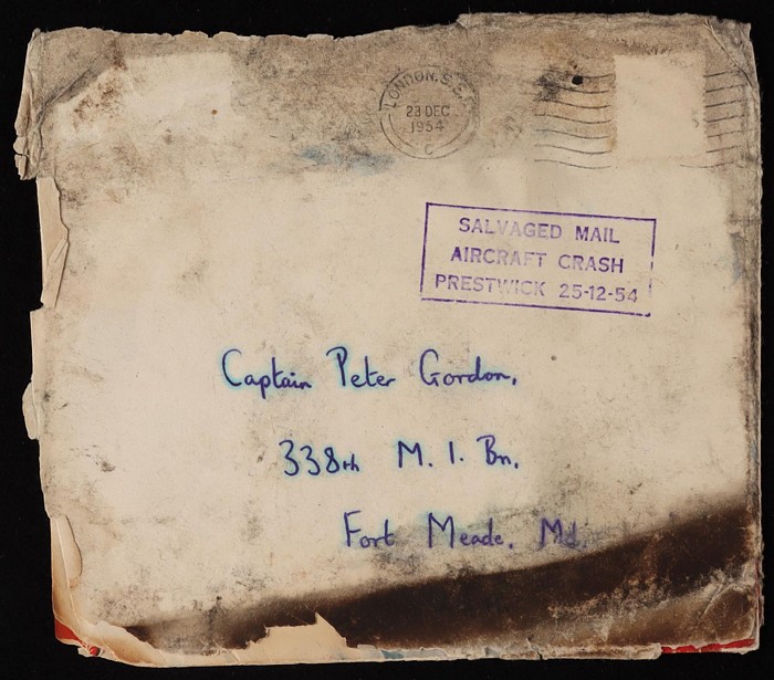 stamps floated away, charred, missing 2 flaps etc, with 'London 23 DEC 1954' pmk. Christmas card to USA, cover with 2 strikes of cachet 'Salvaged Mail Aircraft Crash Prestwick 25 12 54' with another strike on the OHBMS PO envelope used to send to