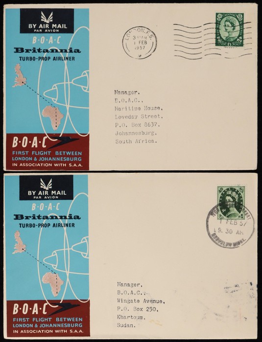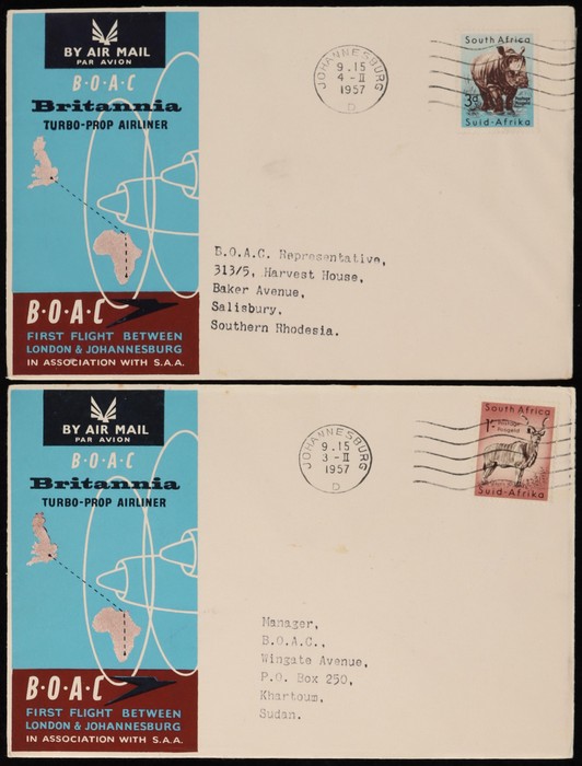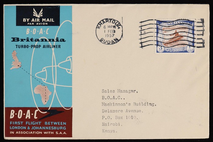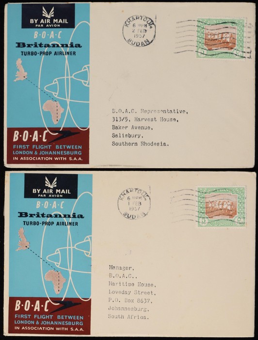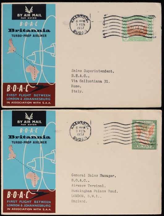 Johannesburg FFC intermediates from Sudan to Kenya, Sthn Rhodesia & Sth Africa, plus return flight Sudan to Italy & GB. (5) (Image1) (Image2)