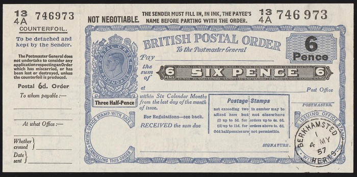 blue Postal Order wmk E II R, with 'Berkhampsted / Herts / 4 MY 57' issue postmark, but not cashed, with counterfoil. Superb fresh UNC. (Image1)