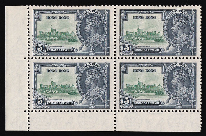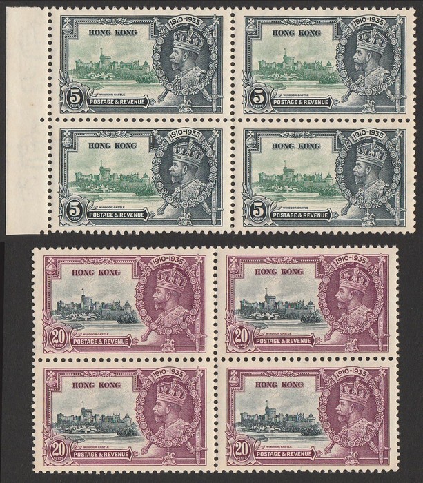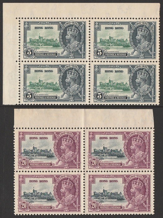 Jubilee 5c & 20c, marginal blks of 4. Stamps VF MNH. SG 134 & 136 cat £162 for M singles, should be at least double, £324 MNH, plus premium for blks. (2 blks).