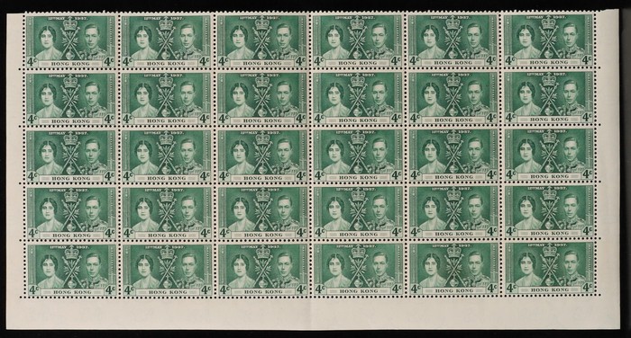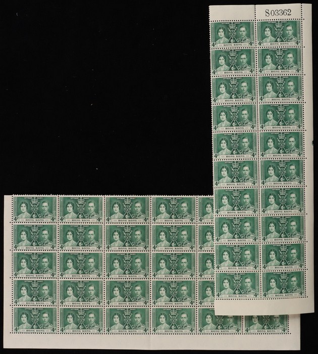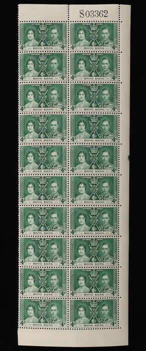 Coronation 4c green bottom blk of 30 & right blk of 20 with sheet no. VF fresh MNH. SG 137 cat £225 for singles, plus premium for blks. (Image1) (Image2)