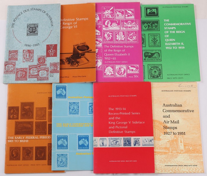 pre-decimal Technical Publications on stamps 8 of 9 produced (ex Commems 1960-65) inc Early Federal Period 1901-1912, Early Commonwealth Period & The Kangaroo, 1913-14 Recess Printed Series & The KGV Sidefaces & Pictorial Definitive Stamps, The