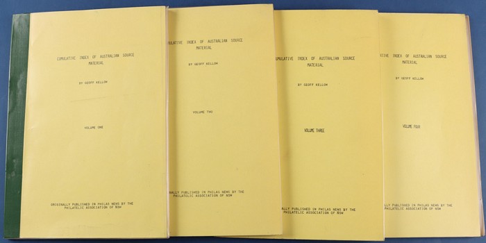 Index of Australian Source material by Geoff Kellow. 4-Volume set with references to ASM, ACCC (NSW), P From A, Sydney Views, Aust Post Philatelic Bulletins, plus many other Philatelic Journals to mid 1970s. (Image1) (Image2)