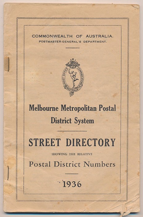 Metropolitan Postal District System - 'Street Directory' showing the relative Postal District Numbers. Pub PMG Dept 1936. Missing front cover o/w GC. (Image1)